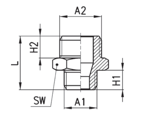Heksa -nänni kahden kierteitetyn putken tai liitosten kytkemiseksi ja putken pituuden pidentämiseksi, kuusikulmainen keskiosa kiristyminen jakoavaimella.