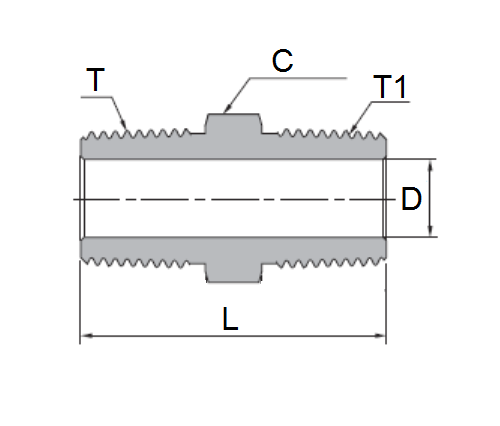 Heksa -nänni kahden kierteitetyn putken tai liitosten kytkemiseksi ja putken pituuden pidentämiseksi, kuusikulmainen keskiosa kiristyminen jakoavaimella.